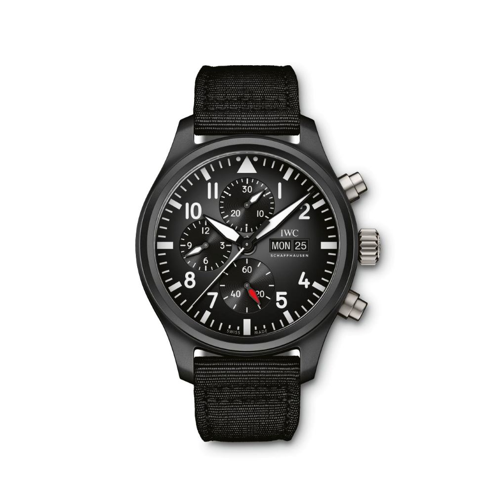 El Reloj de Aviador 43 TOP GUN cuenta con una caja hecha de cerámica negra, una esfera negra y una corona y fondo de caja de titanio.