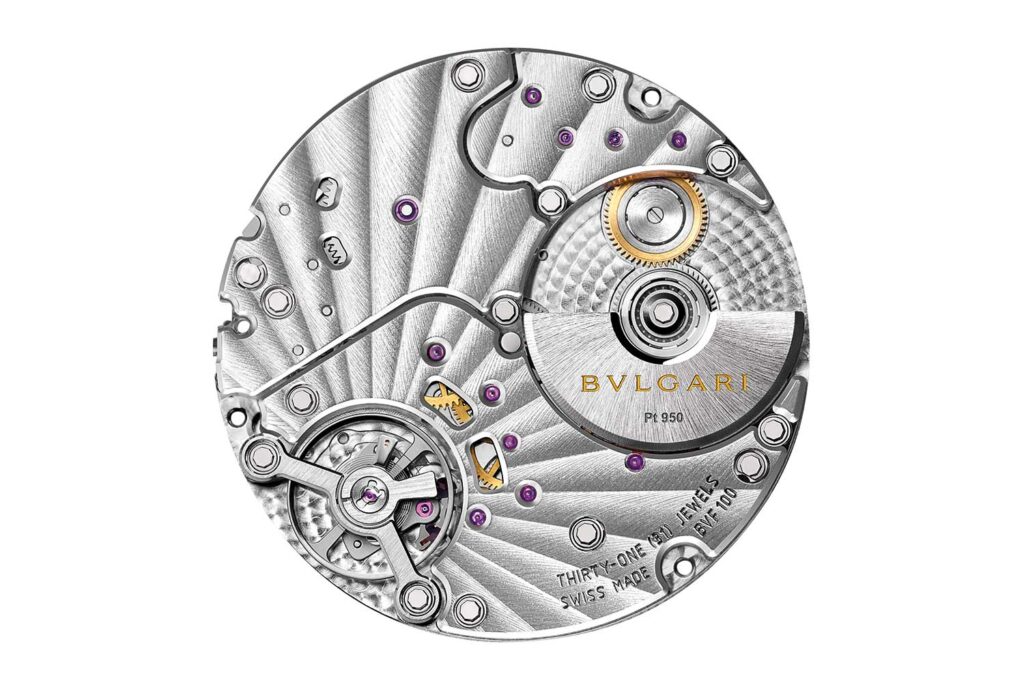 La verdadera revolución técnica se encuentra en el interior con el debut del calibre BVF 100. Este movimiento automático de manufactura ha sido diseñado desde cero para este formato más compacto, logrando una reducción del 20% en su volumen total en comparación con el calibre BVL 138 de la versión de 40 milímetros.