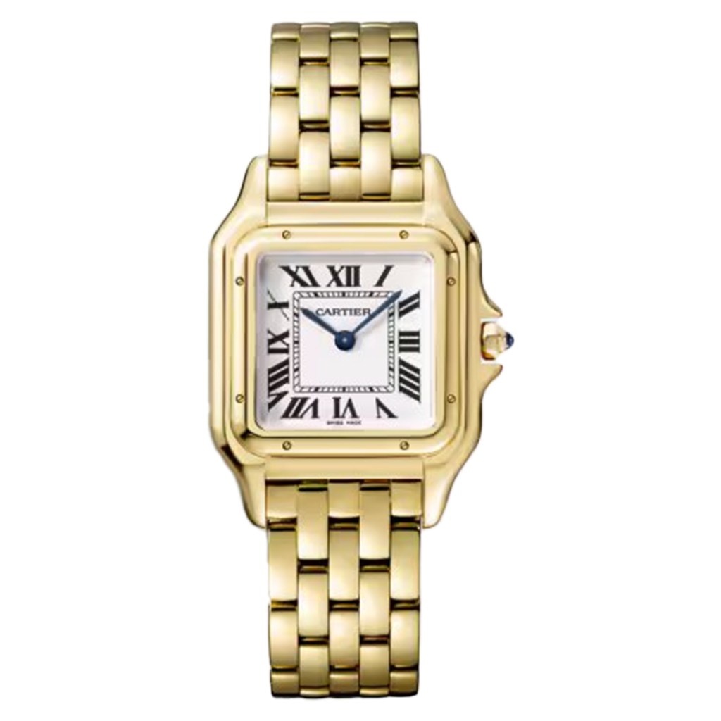 Ballon Bleu de Cartier watch, 42 mm. Self-winding mechanical movement, calibre 1847 MC. Steel case, 18-carat (750/1000) yellow gold fluted crown set with a cabochon-shaped synthetic spinel. Silver-coloured guilloché dial. Sword-shaped hands in blued steel. Sapphire crystal. Calendar aperture at 3 o’clock. Two-tone interchangeable strap. Thickness: 13 mm. Water-resistant to 3 bar (approx. 30 metres/100 feet).