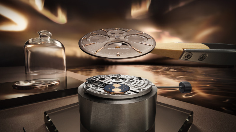 Este guardatiempo ofrece una visualización de calendario completo (año, mes, día y fecha) junto con una fase lunar, diseñado para mantener la precisión sin necesidad de ajustes manuales hasta el año 2100. Para facilitar su uso, todas las indicaciones del calendario están sincronizadas y pueden ajustarse simultáneamente mediante un único corrector. Con una caja de 39 mm y un grosor de 9.2 mm, está disponible en acero inoxidable con carátula azul grisáceo o en oro rosa de 18 quilates con una carátula en tono bronce. Utiliza el Calibre 868 y garantiza una autonomía de 70 horas.