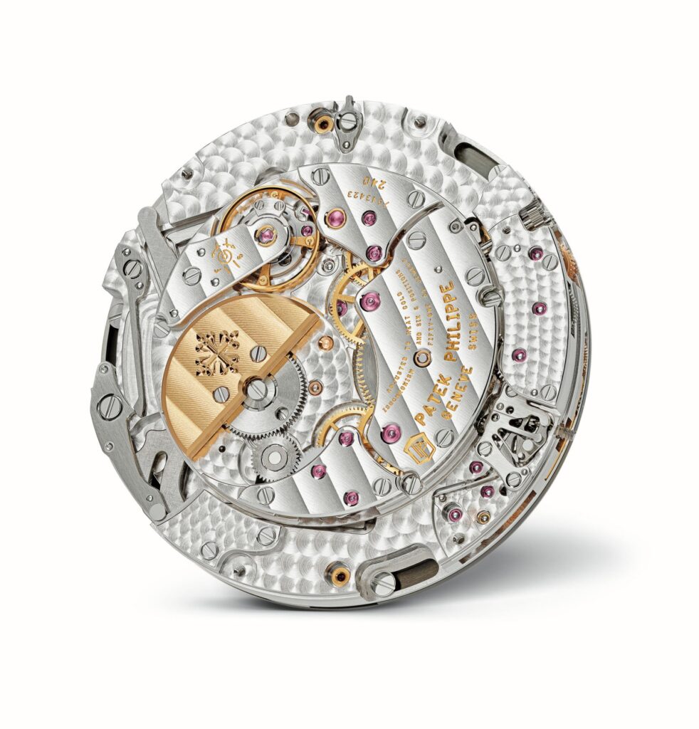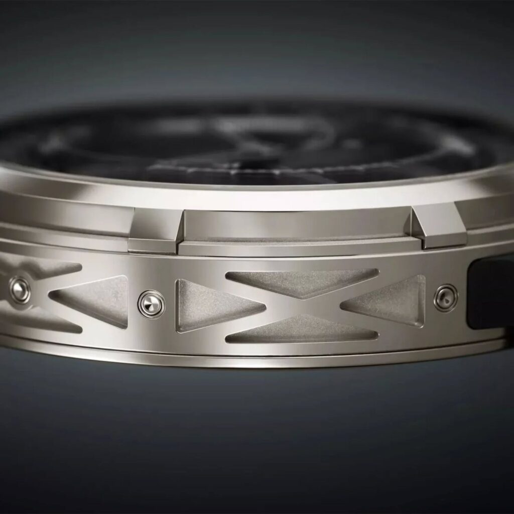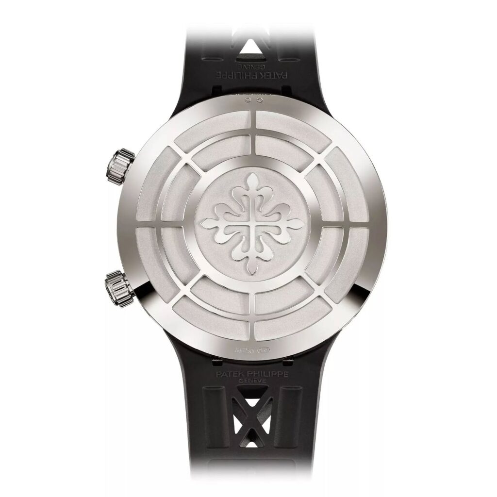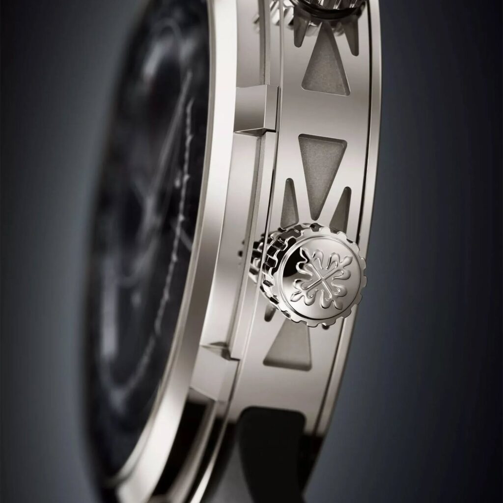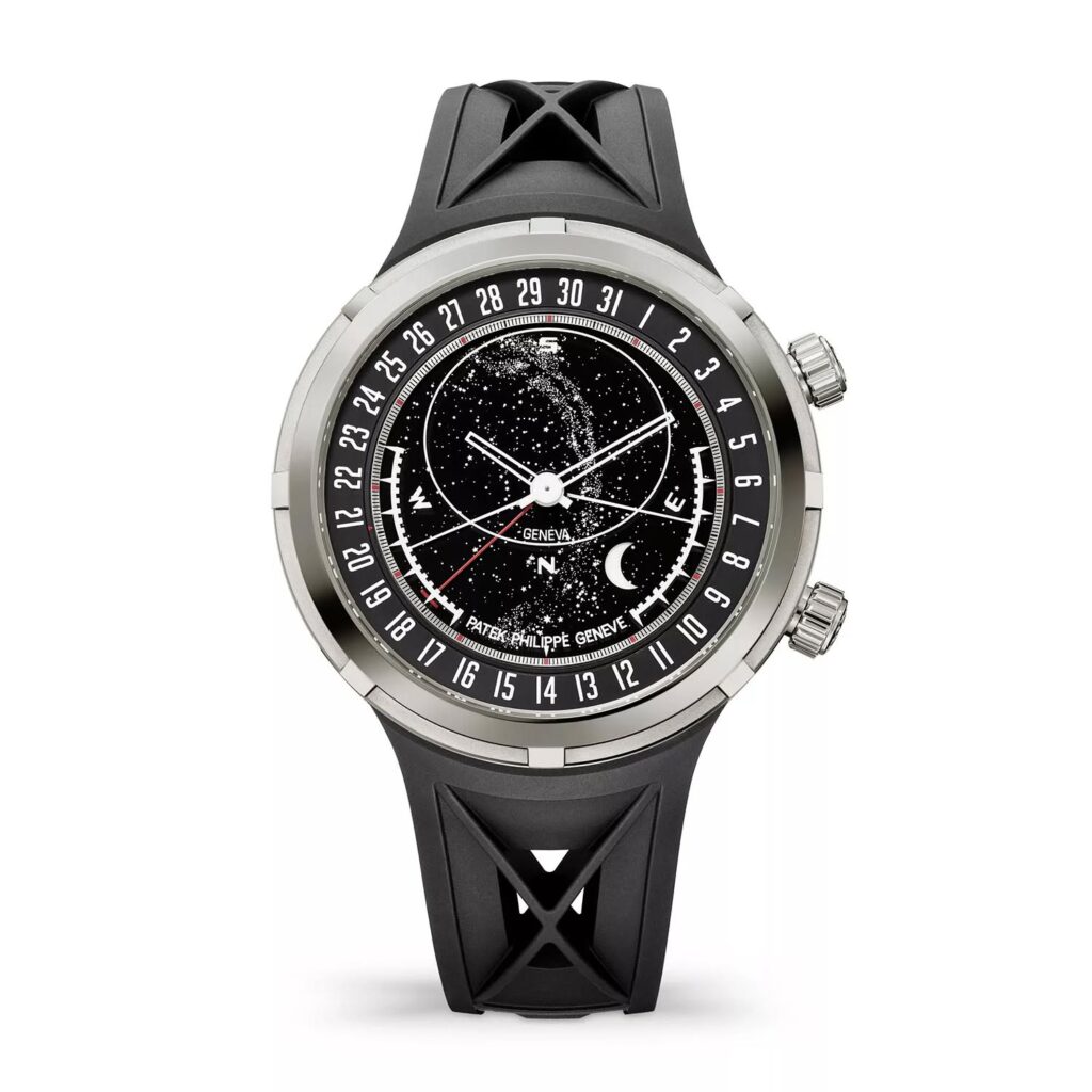 En cuanto a su exterior, Patek Philippe ha optado por una caja de 47 mm en oro blanco con un diseño sin asas (lugless), lo que permite que el reloj se asiente con mayor comodidad y parezca más compacto en la muñeca de lo que su diámetro sugiere. La carrura y el fondo de caja sólido presentan un decorado en forma de «X» grabado, un detalle contemporáneo que se extiende hasta la correa de compuesto negro integrada. Las dos coronas situadas a las 2 y las 4 horas permiten el ajuste manual de las indicaciones astronómicas y el remonte del movimiento, integrándose de manera fluida en la geometría moderna de la caja.